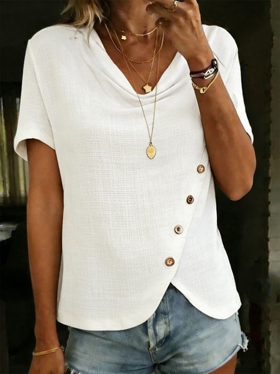 Women's Elegant Solid Color Ruffled Collar Button 100% Cotton Short-sleeved T-shirt