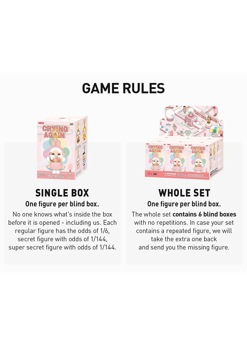 The "Crybaby Crying Again" series from POP MART refers to a line of blind box figures featuring characters with tear-stained or weeping expressions. These figures are part of a larger CRYBABY collection, known for its focus on expressing deep emotions and complex feelings. The "Crying Again" series specifically highlights the emotional aspect of the CRYBABY figures.